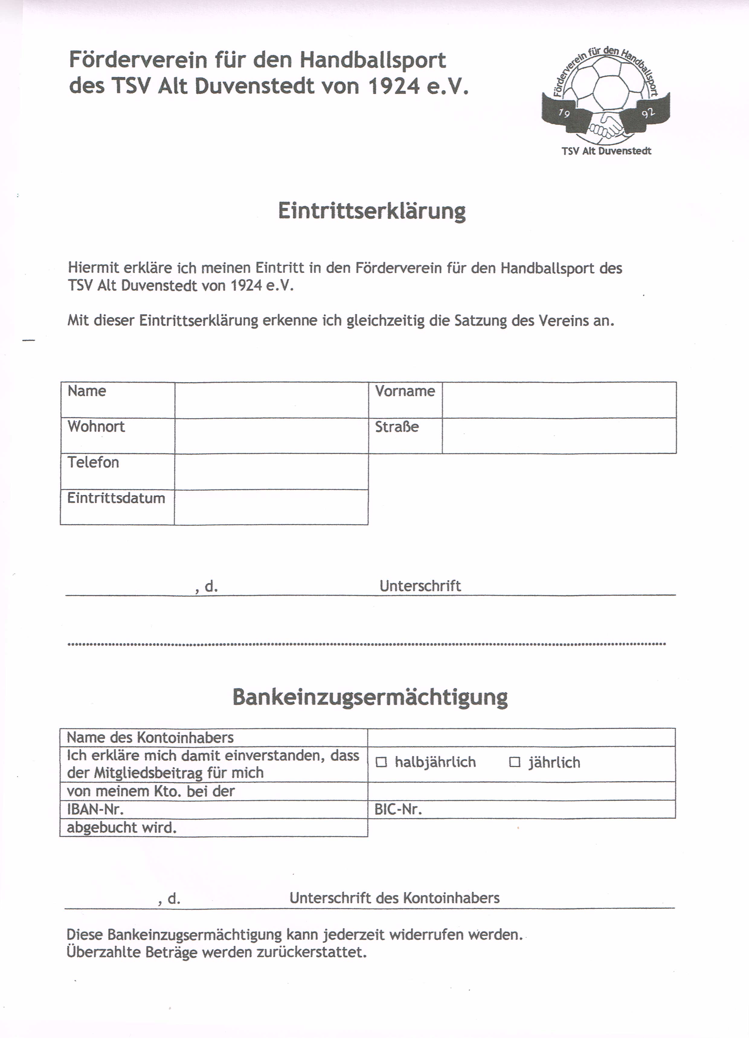 Eintrittserklärung in den Förderverein für den Handballsport des TSV Alt Duvenstedt